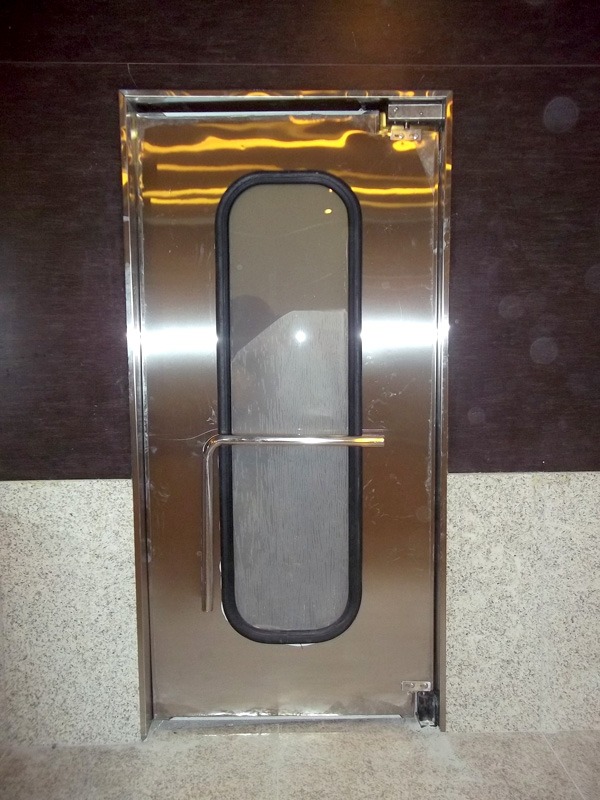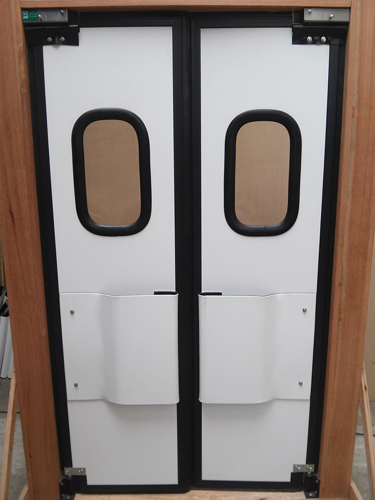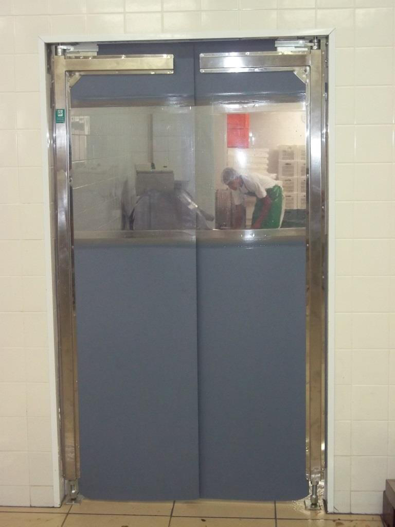 Porta em plástico ISOPOWER rígido de 30 mm de espessura, visor transparente em policarbonato, sistema vai e vem , borracha de vedação em vinilona (em toda extensão da porta) e acabamento em aço inox.